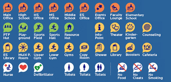 Gemeinsam mit der AIS entwickelten wir ein Orientierungssystem auf der Basis von bunten Piktogrammen, deren Grundform eine Sprechblase darstellt. Kinder und Jugendliche aus allen Ländern sehen täglich diese Schilder. Es war uns wichtig, eine grafische Form zu finden, die auch für diese Zielgruppe ansprechend ist und dennoch nüchtern und informativ bleibt. Das bunte Farbsystem hilft: Grün wird verwendet für Orte, die sich außerhalb des Gebäudes befinden. Orange bezeichnet Orte für administrative Zwecke, Gelb steht für all jene Orte, an denen Aktivitäten rund um das Lernen, für die Schüler stattfinden. Krankenschwester und Toiletten erhielten einen weißen, neutralen Grund.